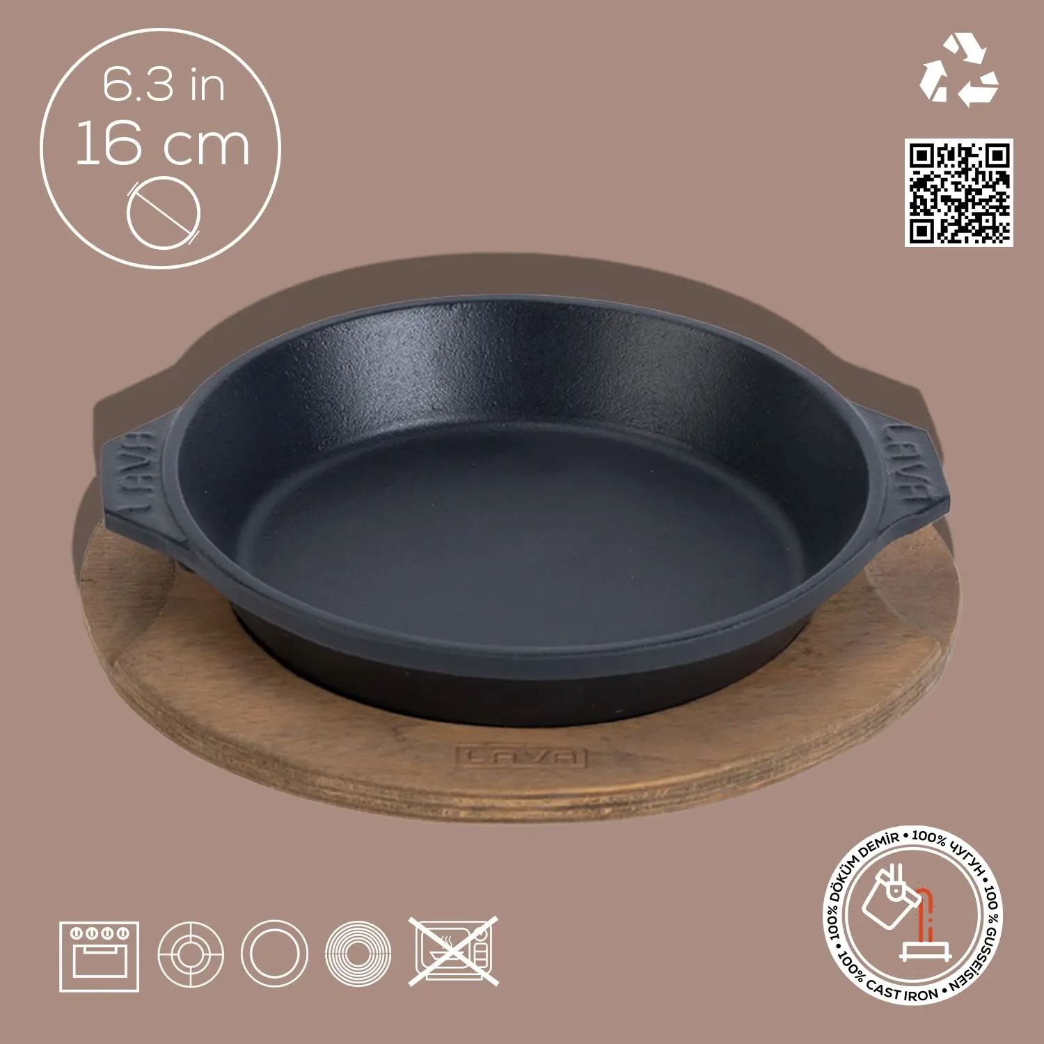 Kerek tálaló, öntöttvasból, fa állvánnyal, átmérője 16 cm, űrtartalma 0,32 l, Lava márka