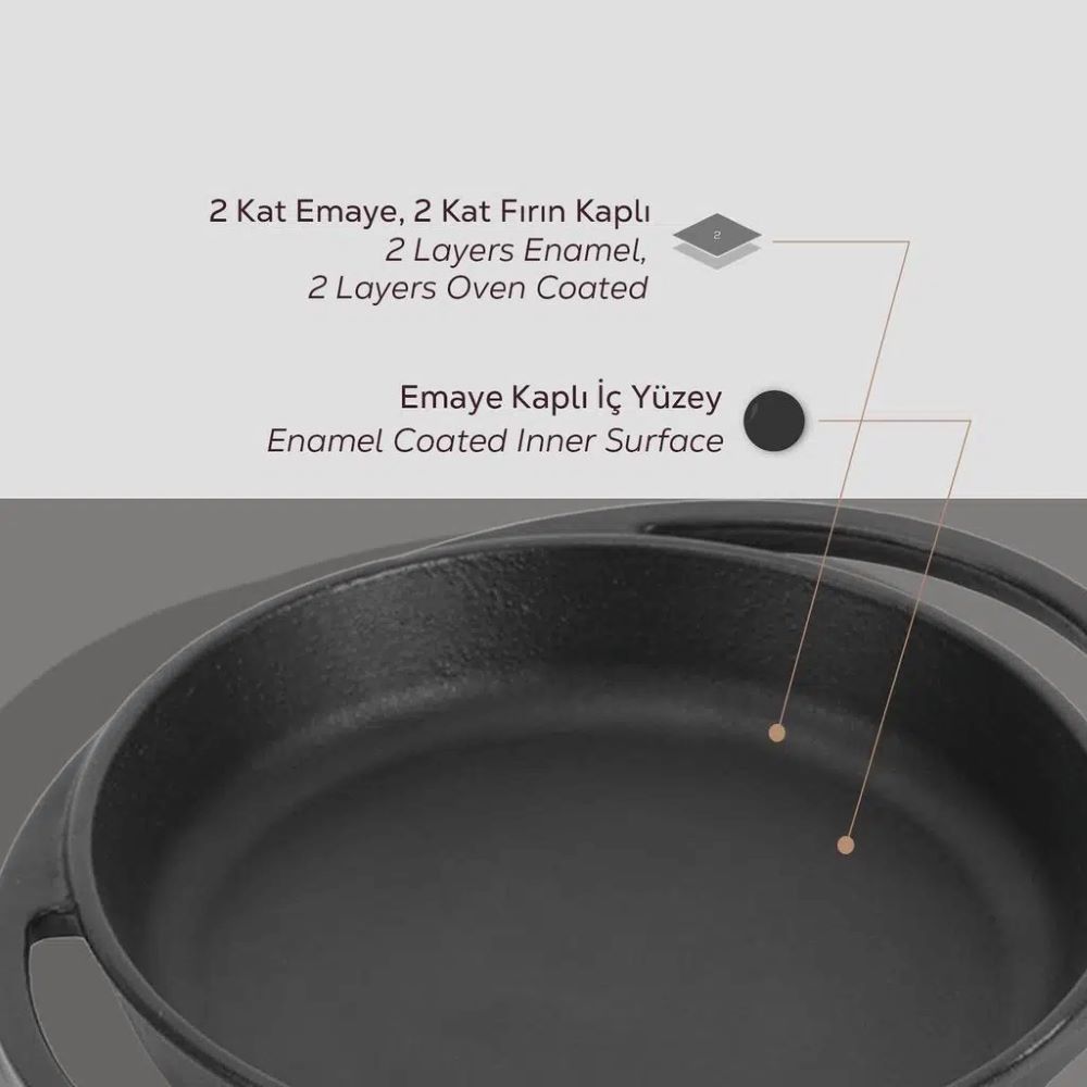 A tálaló edény falai 4 mm vastagok, és belsejében a tálaló edényt egy fekete zománcréteggel bevonják, amely megkönnyíti a tapadásmentes felület kialakulását zsírral történő főzéskor.