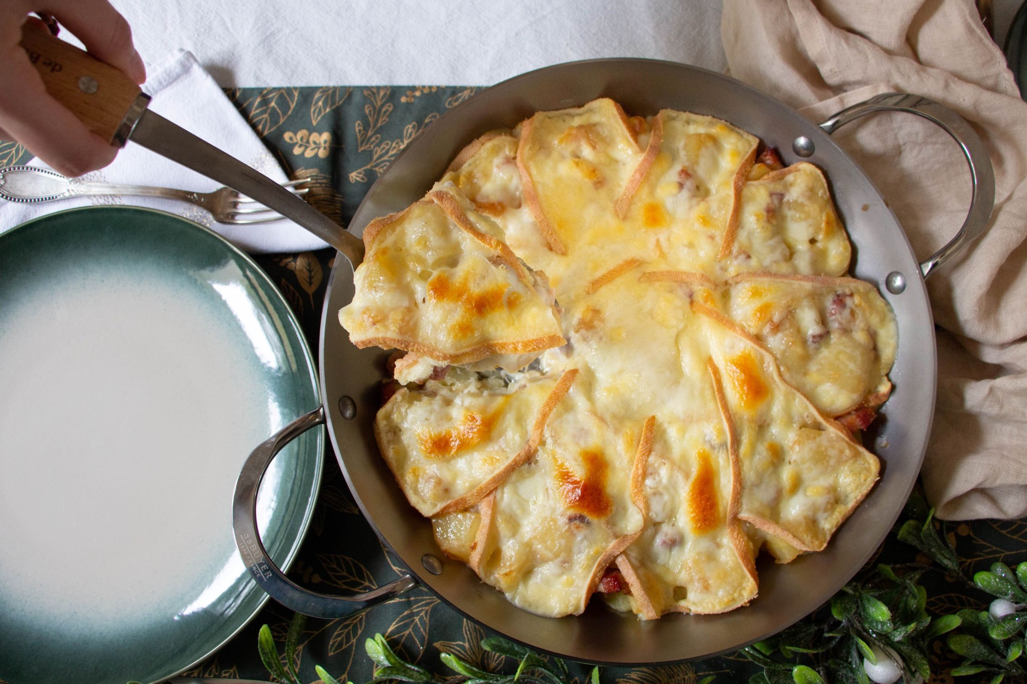 A paella serpenyő autentikus "Lyonnaise" dizájnnal rendelkezik, lekerekített élekkel, amelyek megkönnyítik az élelmiszerek tányérokra való átvitelét, az ívelt, francia stílusú fogantyúk pedig rozsdamentes acélból készültek, és tömör szegecsekkel vannak rögzítve.