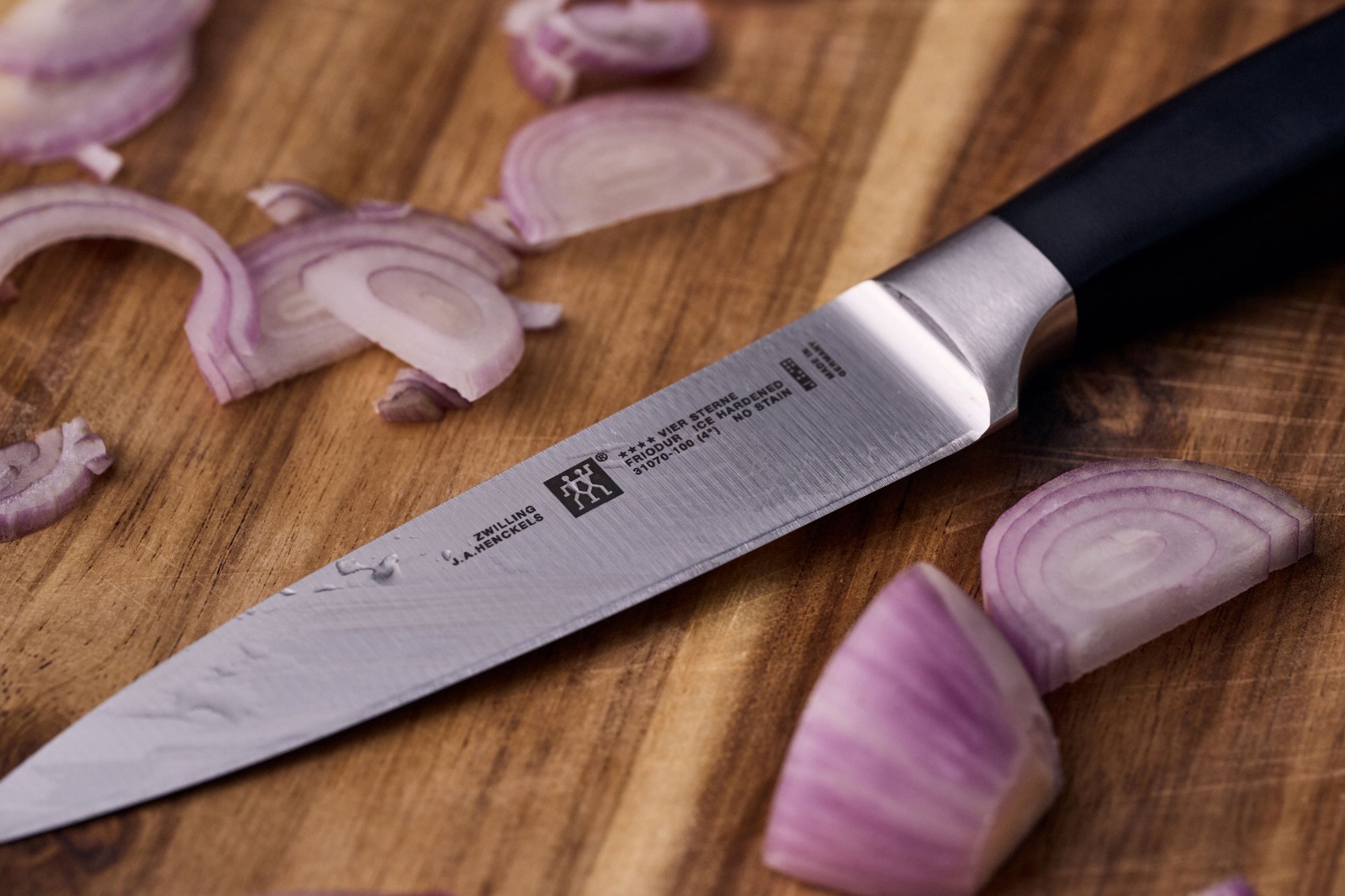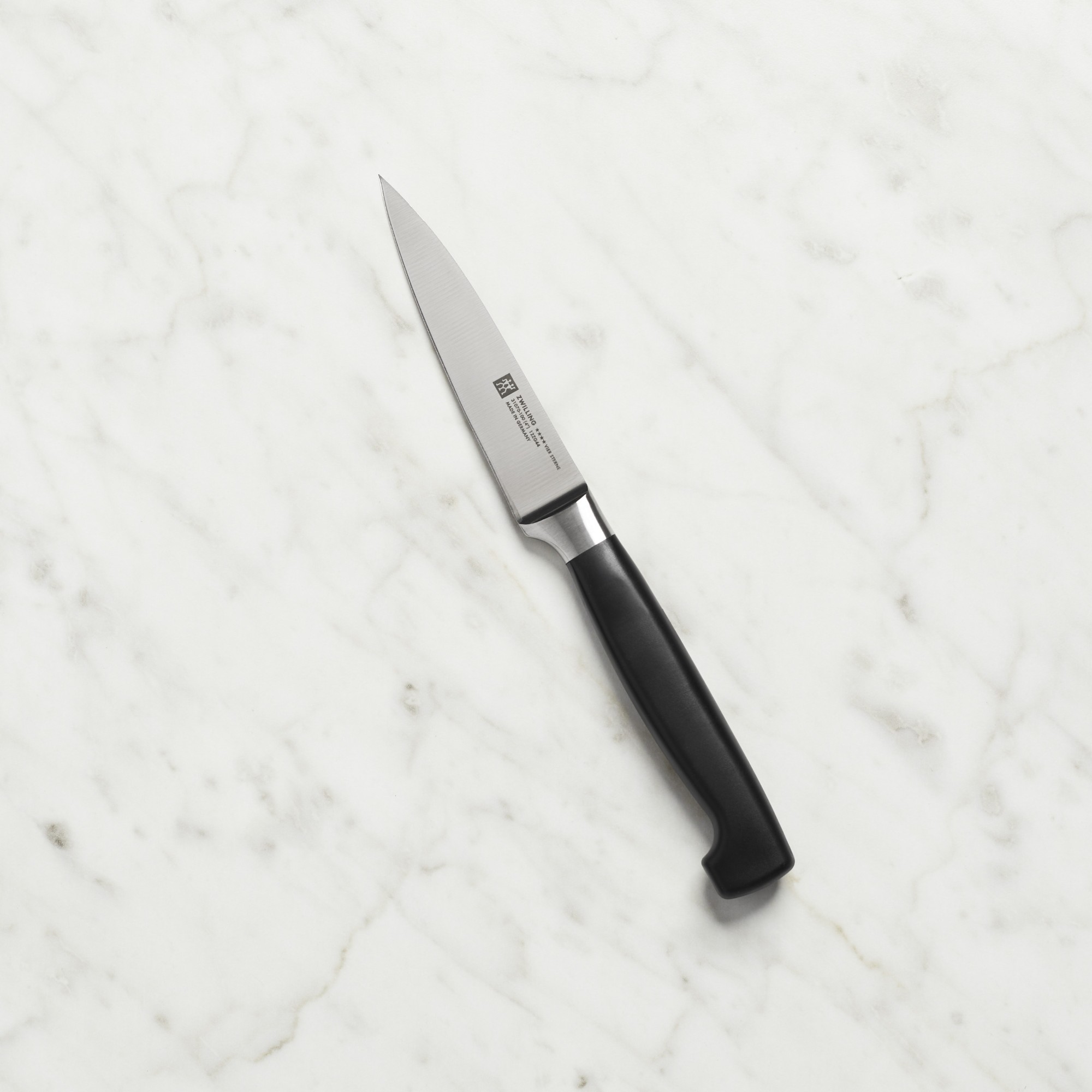 Zwilling márkás kés a héj eltávolításához, 10 cm hosszú pengével, speciális rozsdamentes acélból, amely ellenáll a korróziónak és az ütéseknek.