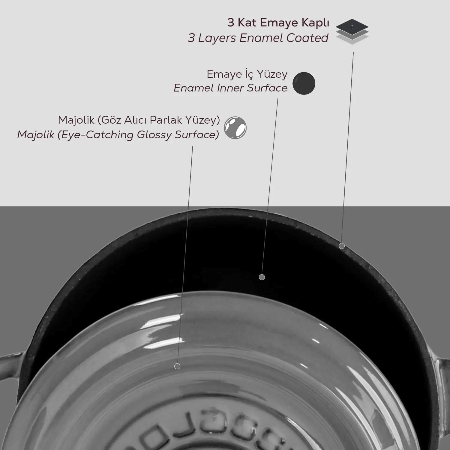 A Premium termékcsalád a speciális "Majolica" színezési technikát alkalmazza, amely egyedi fényes zománcot és nagyon intenzív árnyalatokat ad az edényeknek. A "Majolica" színtechnika három szórt réteg felhordásából áll - az első réteg simább, egyenletesebb felületet kap, a második réteg a fényes hatást, a harmadik réteg pedig a mélység érzetét kelti és fokozza a fényes megjelenést.