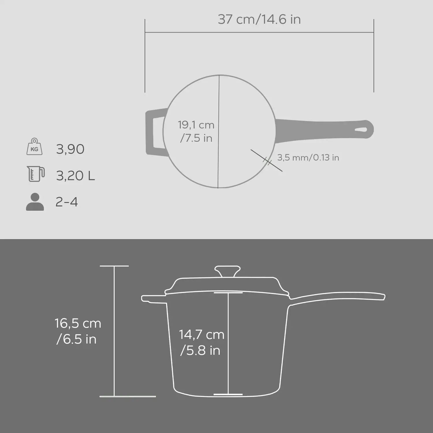 A serpenyő belsejében fekete zománc bevonat van, alapvastagsága 4,5 mm, falvastagsága 3,5 mm.