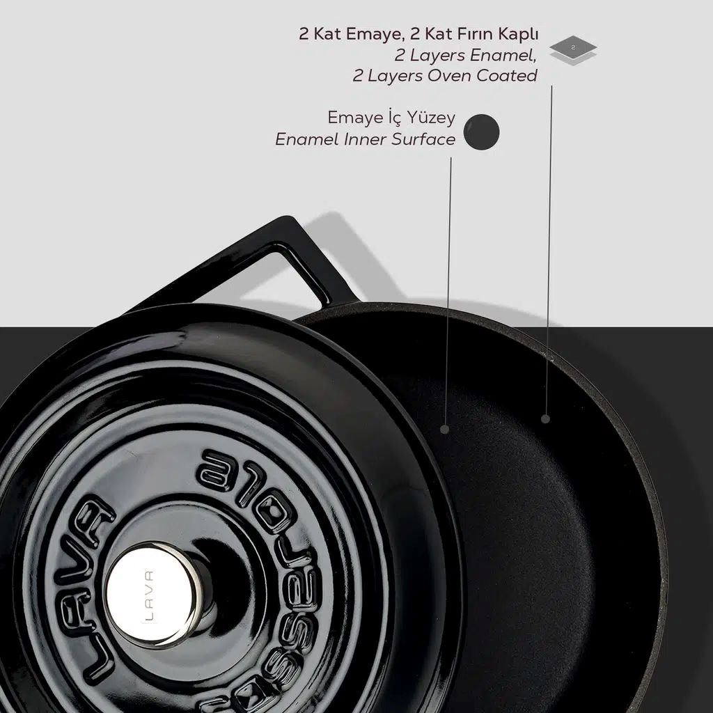 Az üveges zománcot, amelyet a Láva öntöttvas edények külső befejezéséhez használnak, üvegpor permetezésével nyerik 750 -850 ° Chőmérsékleten. Az üvegpor a serpenyő felületéhez tapad, védőréteget hozva létre, amely segít a hő optimális elosztásában is.