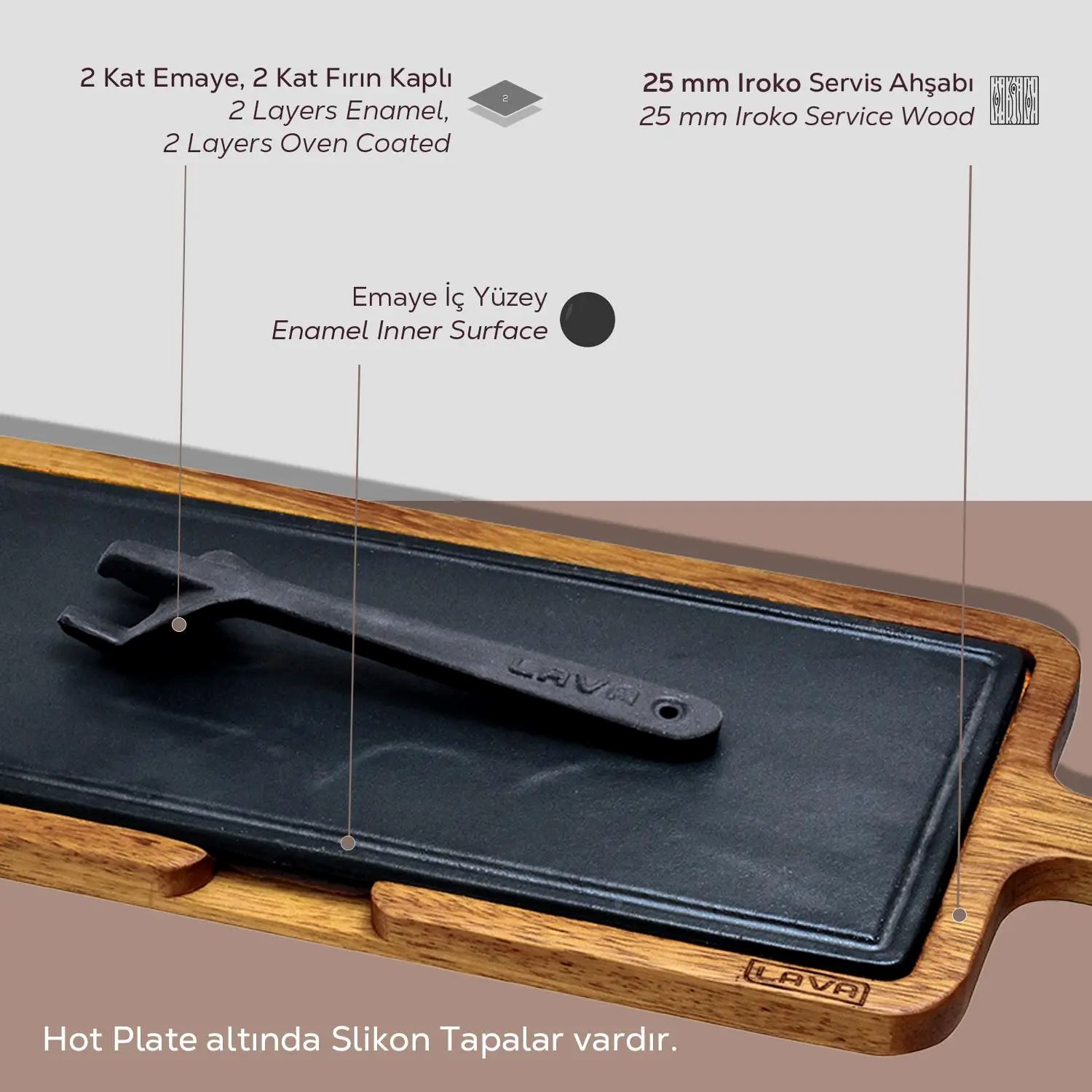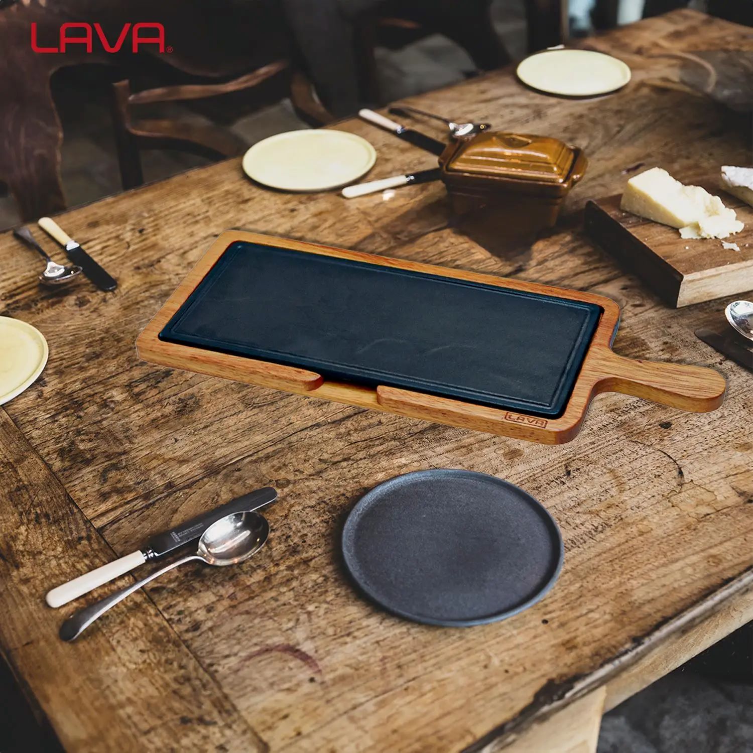 Lava márkájú, öntöttvas tálalótálca, iroko fa alátéttel.