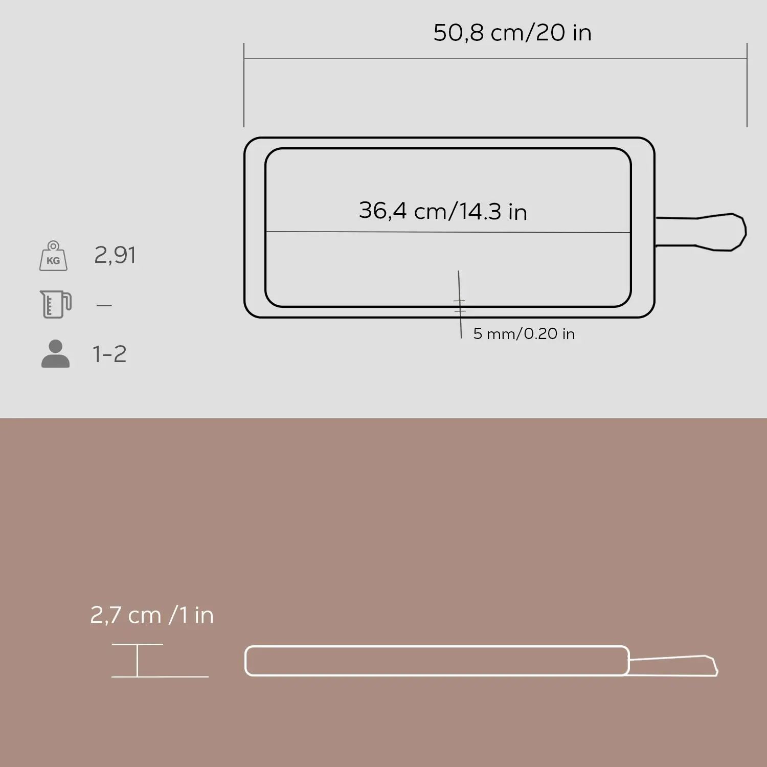 A fa alátét mérete 20 x 50,8 x 2,7 cm, az öntöttvas tálalótálca mérete 17 x 37 cm.