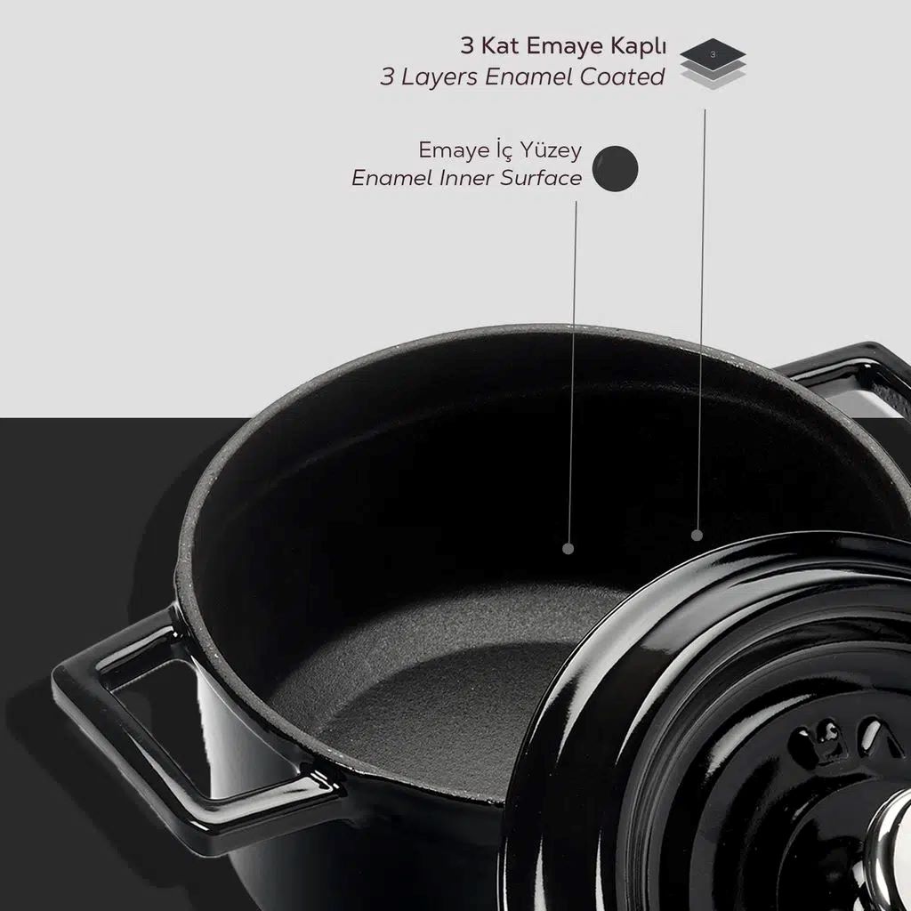 Az edény oldalának vastagsága 4mm. Az edény belső felületén egy fekete zománcréteg van, amely zsiradék használatával egy tapadásmentes réteget biztosít.