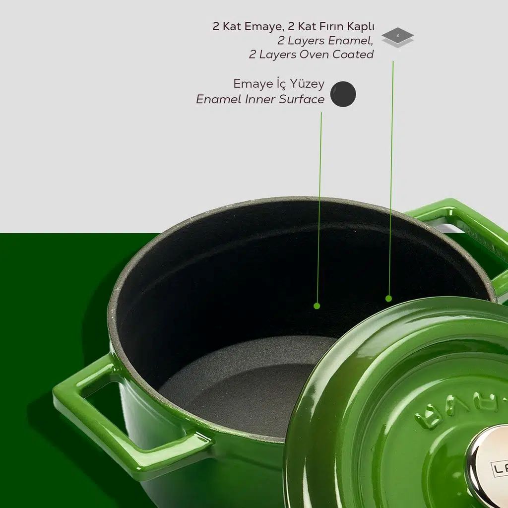 A Lava edények külső rétege üvegzománc, amely az üvegpor 750 - 850°C-on az edényre történő szórását jelenti. Ez az üvegpor az edény oldalára tapad és egy védőréteget képez, ugyanakkor hozzájárul a hő optimális eloszlásához.