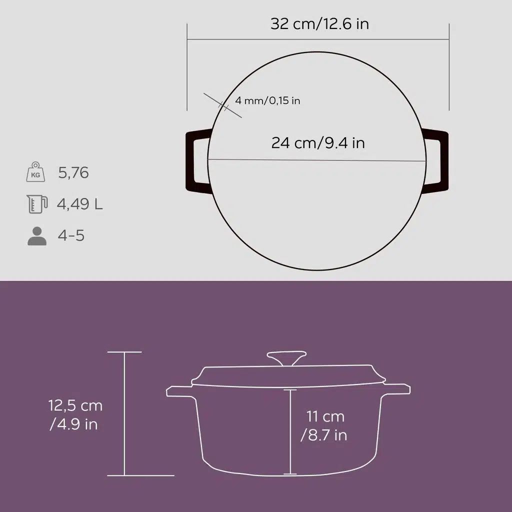 Az alap vastagsága 5 mm. A LAVA edények bármilyen típusú főzőlappal kompatibilisek, beleértve az indukciós főzőlapokat is.