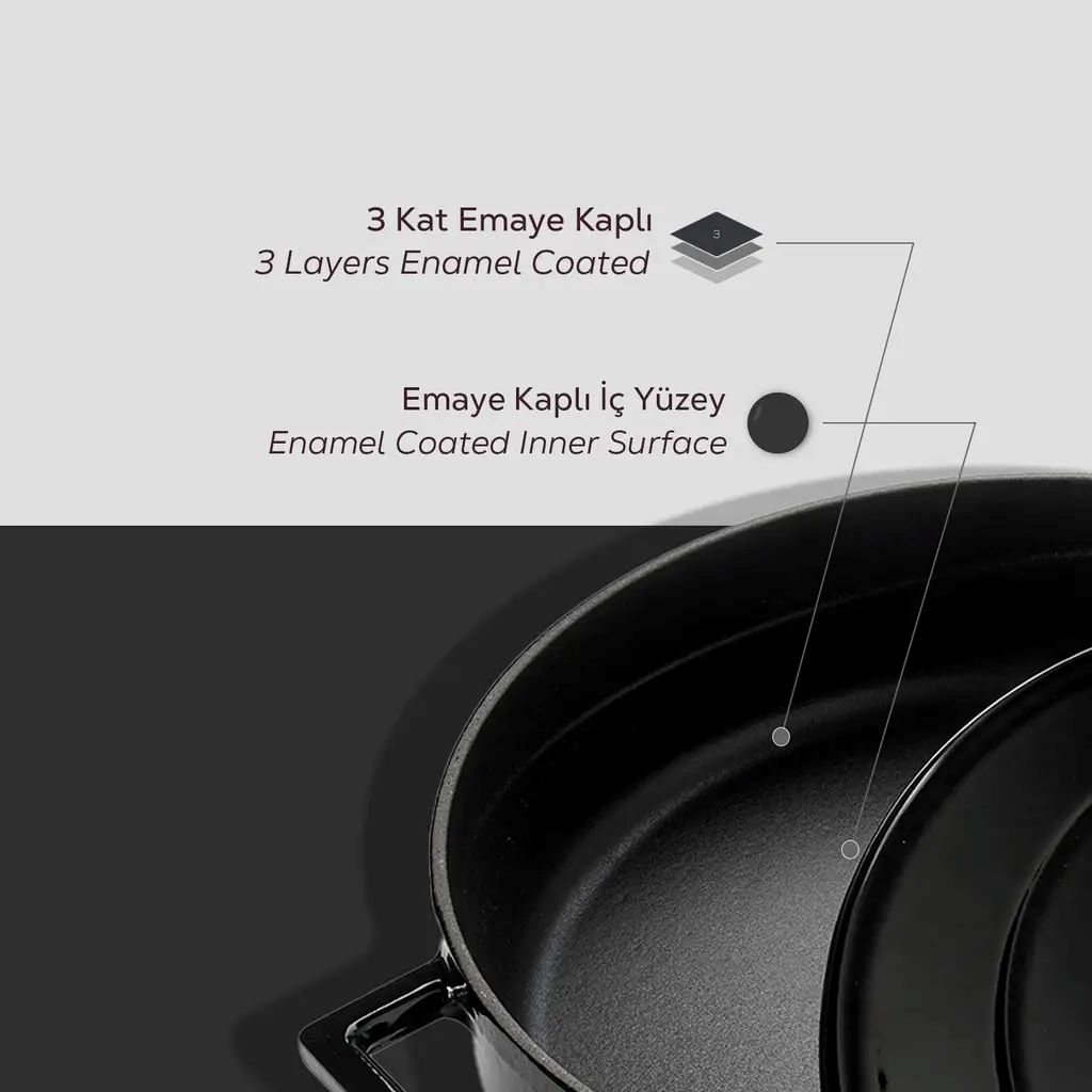 Az edény oldalának vastagsága 4mm. Belső felületén, fekete zománcréteg található amely tapadásmentes réteget képez amikor zsiradék nélkül főz.
