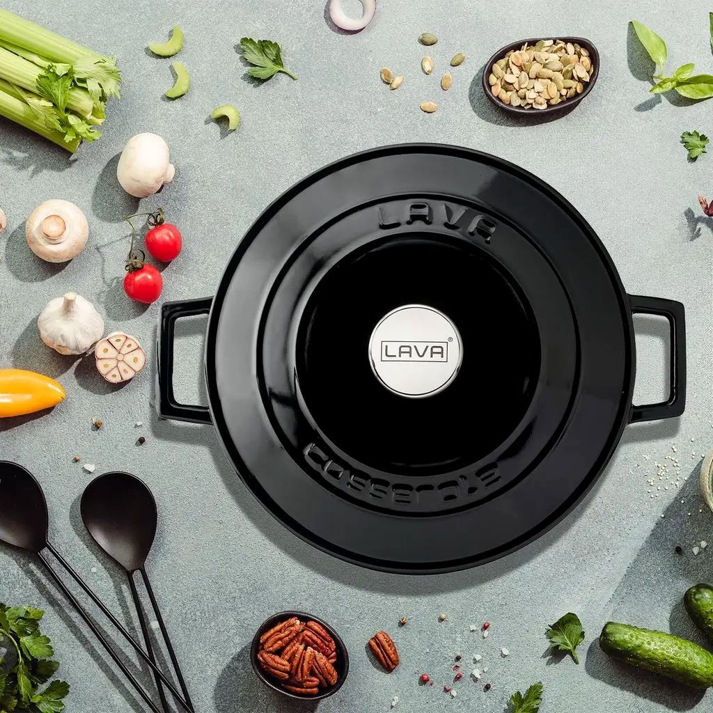 Lava lábas, átmérője 28 cm, űrtartalma 6,7 l, anyaga öntvény.