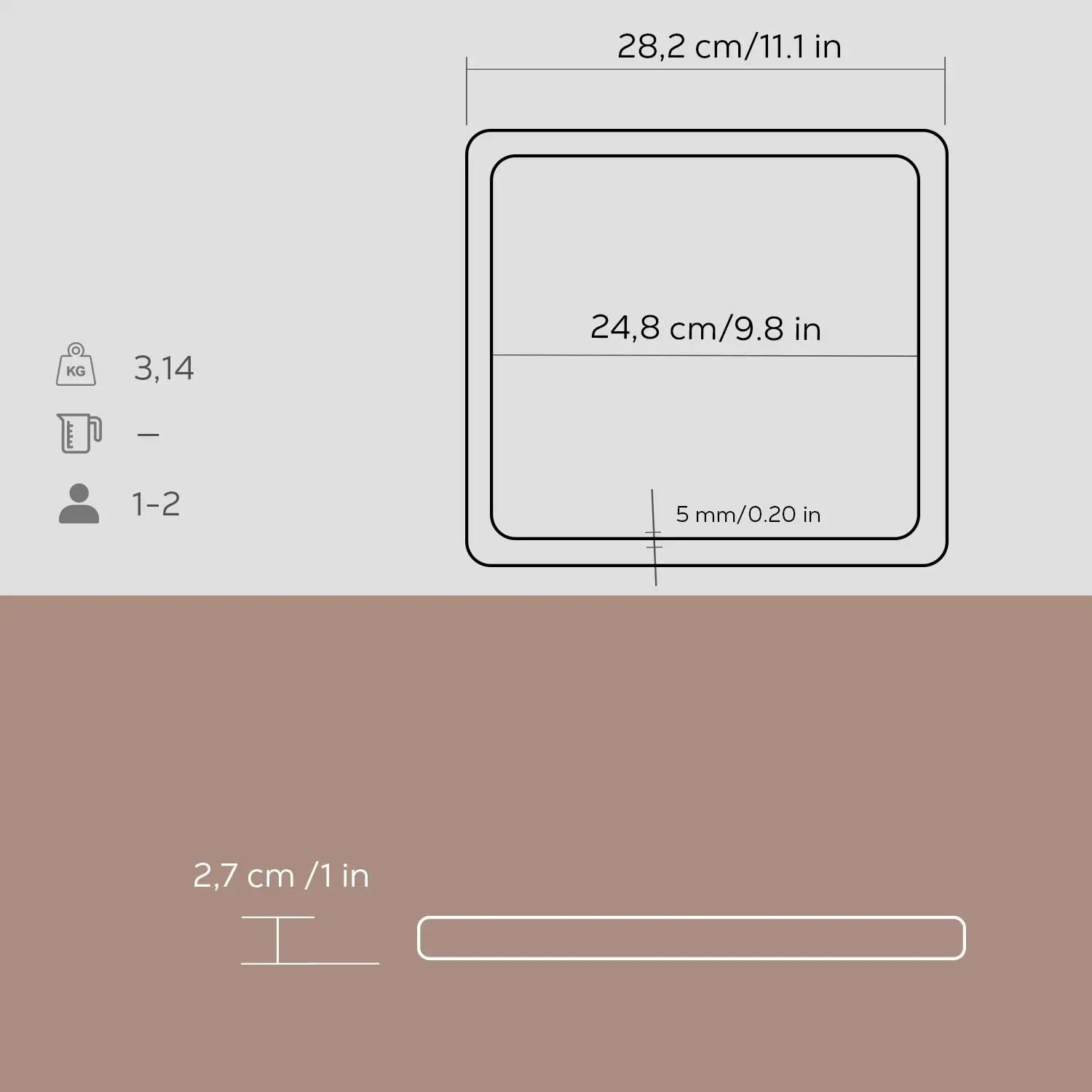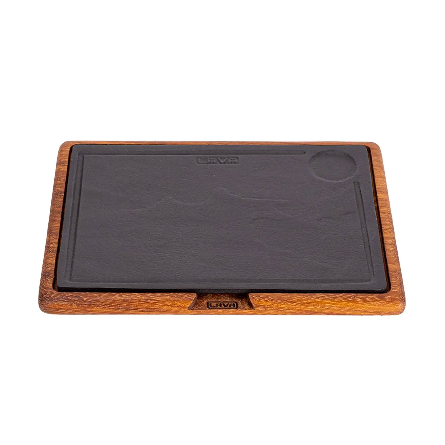 Felszolgáló tál, fából és öntöttvasból készült. Az iroko fából készült állvány méretei 28,2 x 28,2 x 2,7 cm, a tálalótál méretei pedig 25 x 25 cm, így 1-2 adag számára ideális.