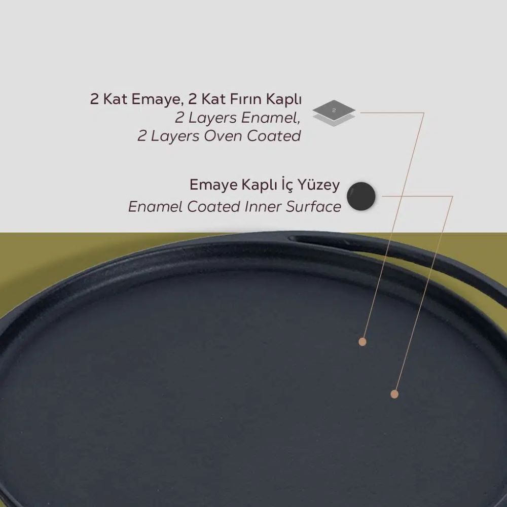 A falak 4 mm vastagok, belülről a tálcát egy réteg fekete zománc bevonattal látták el, ami elősegíti a tapadásmentes felület kialakulását zsíros főzéskor.