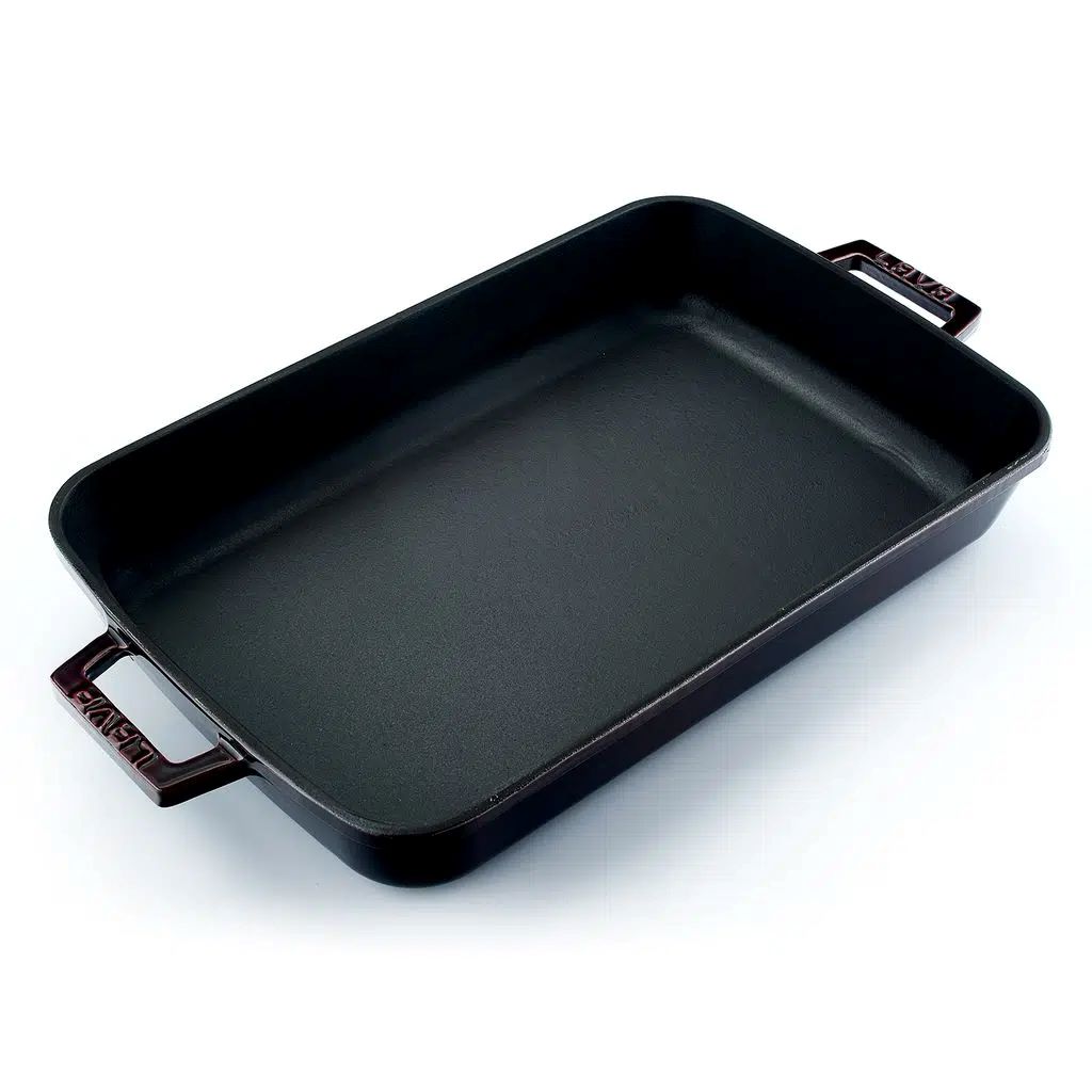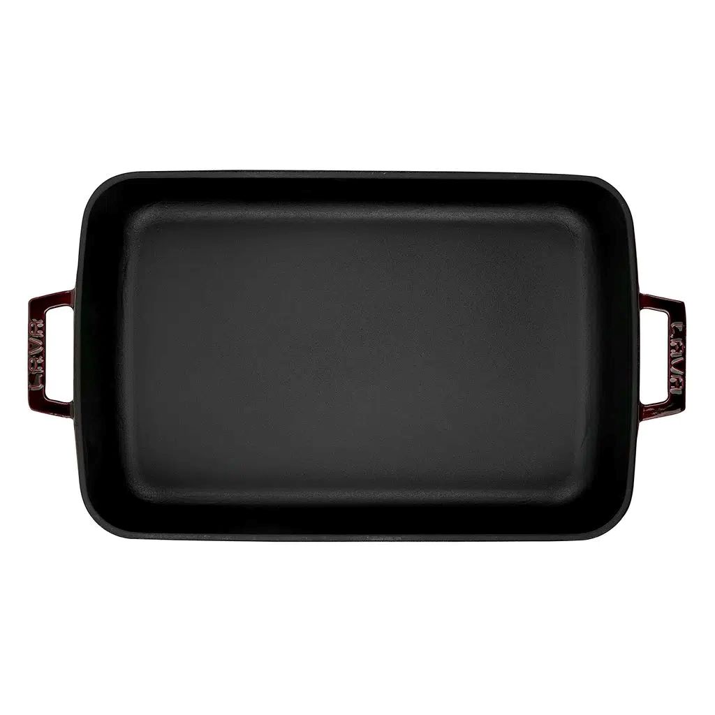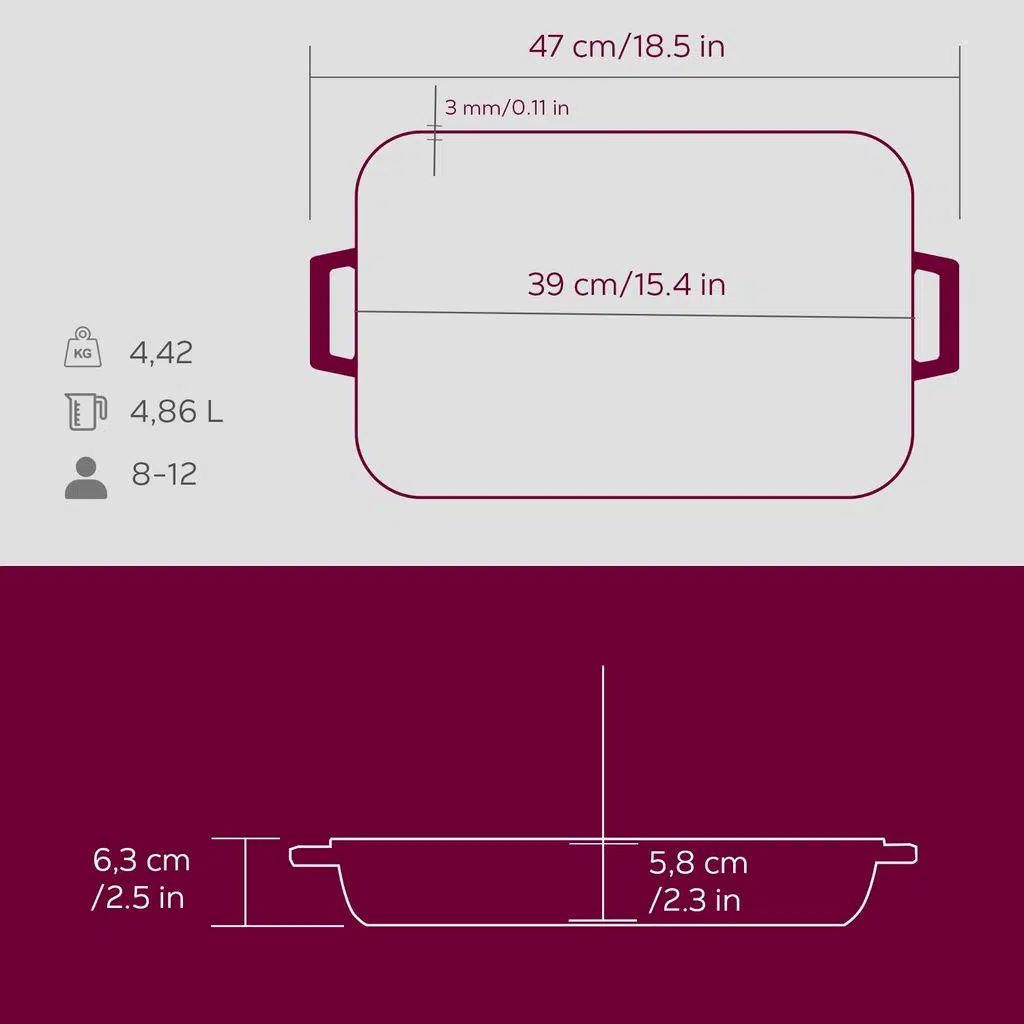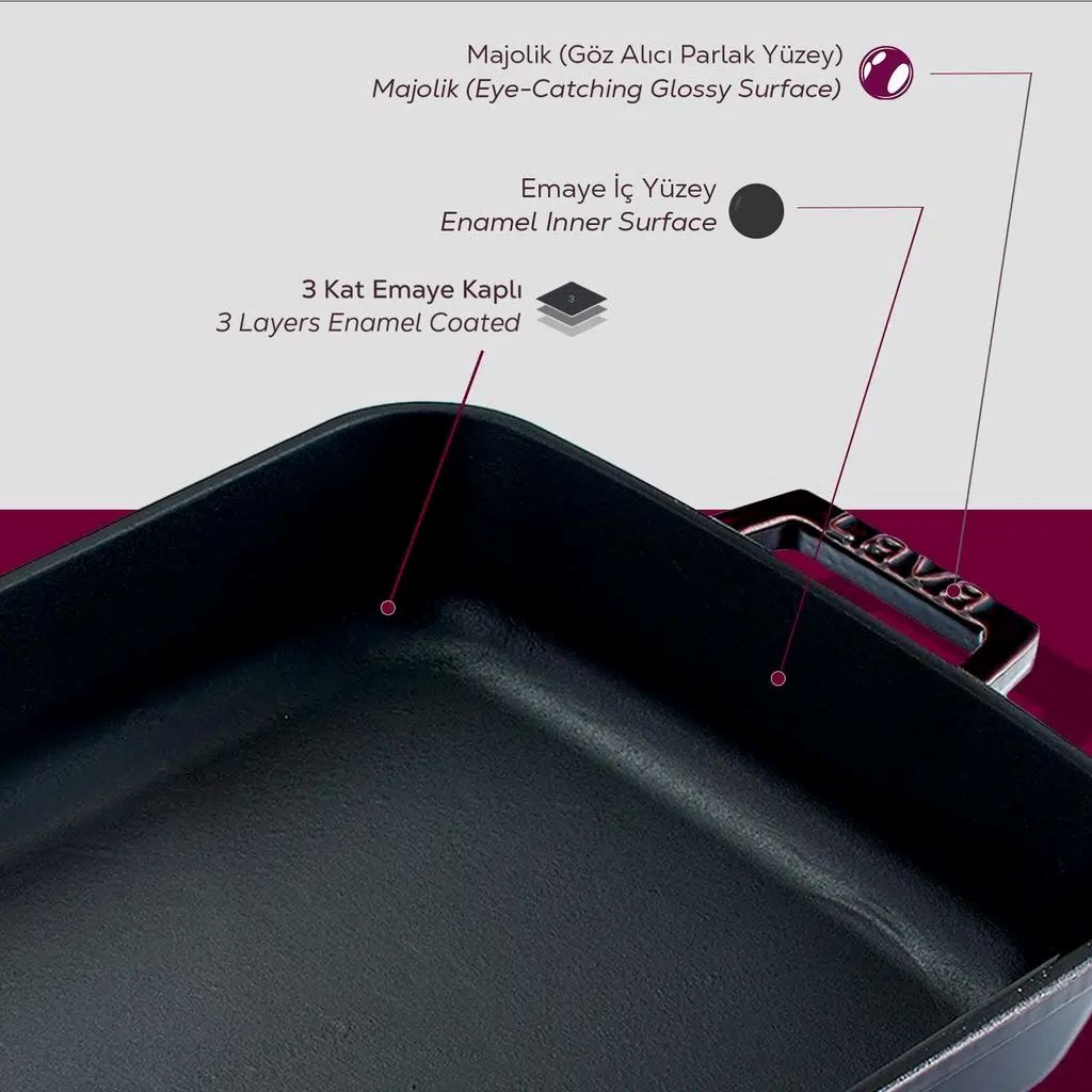 A 4,86 l űrtartalmú sütőlap kívül 3 vastag zománcréteggel, belül pedig matt fekete bevonattal rendelkezik, az alja 5 mm, az oldalai pedig 3 mm vastagok.