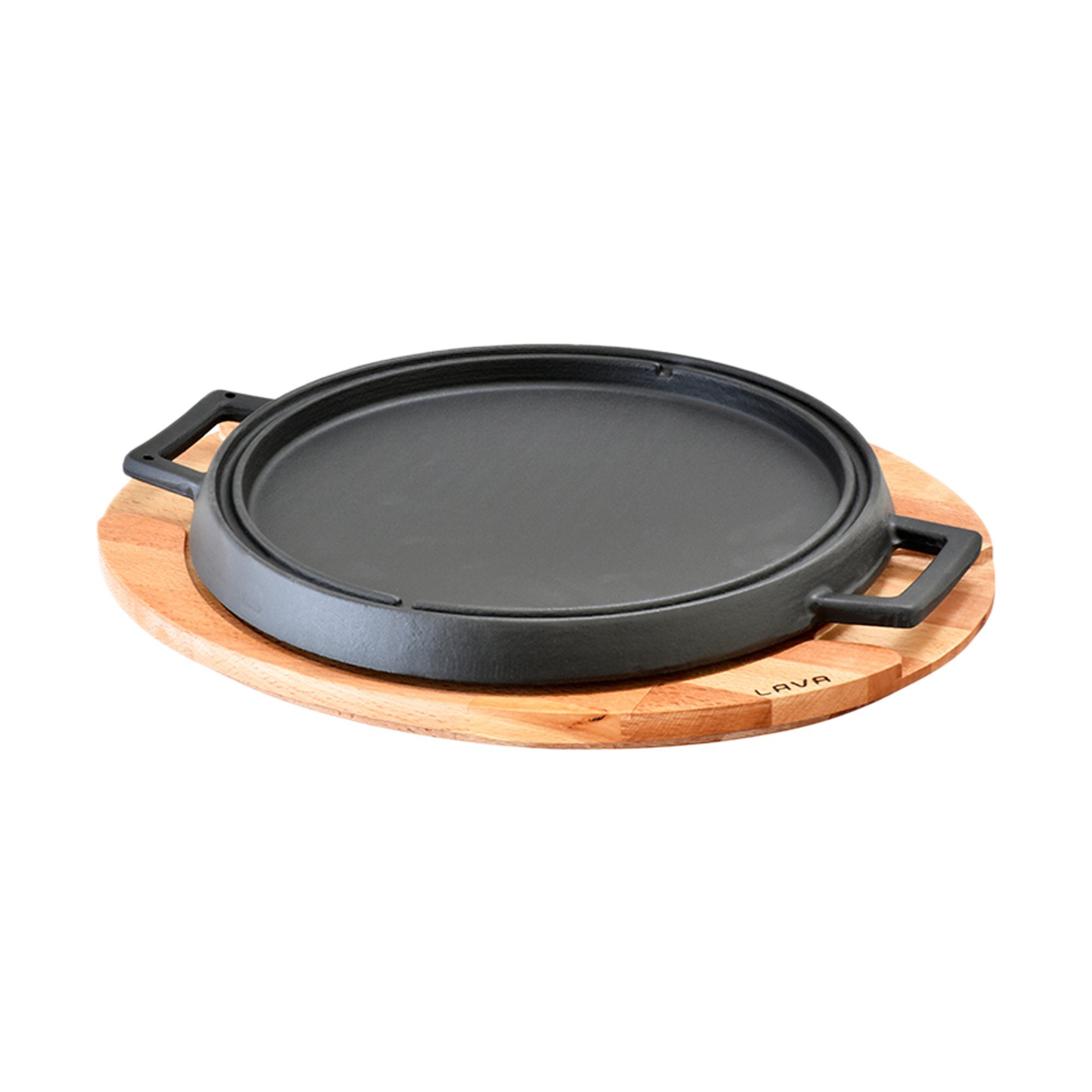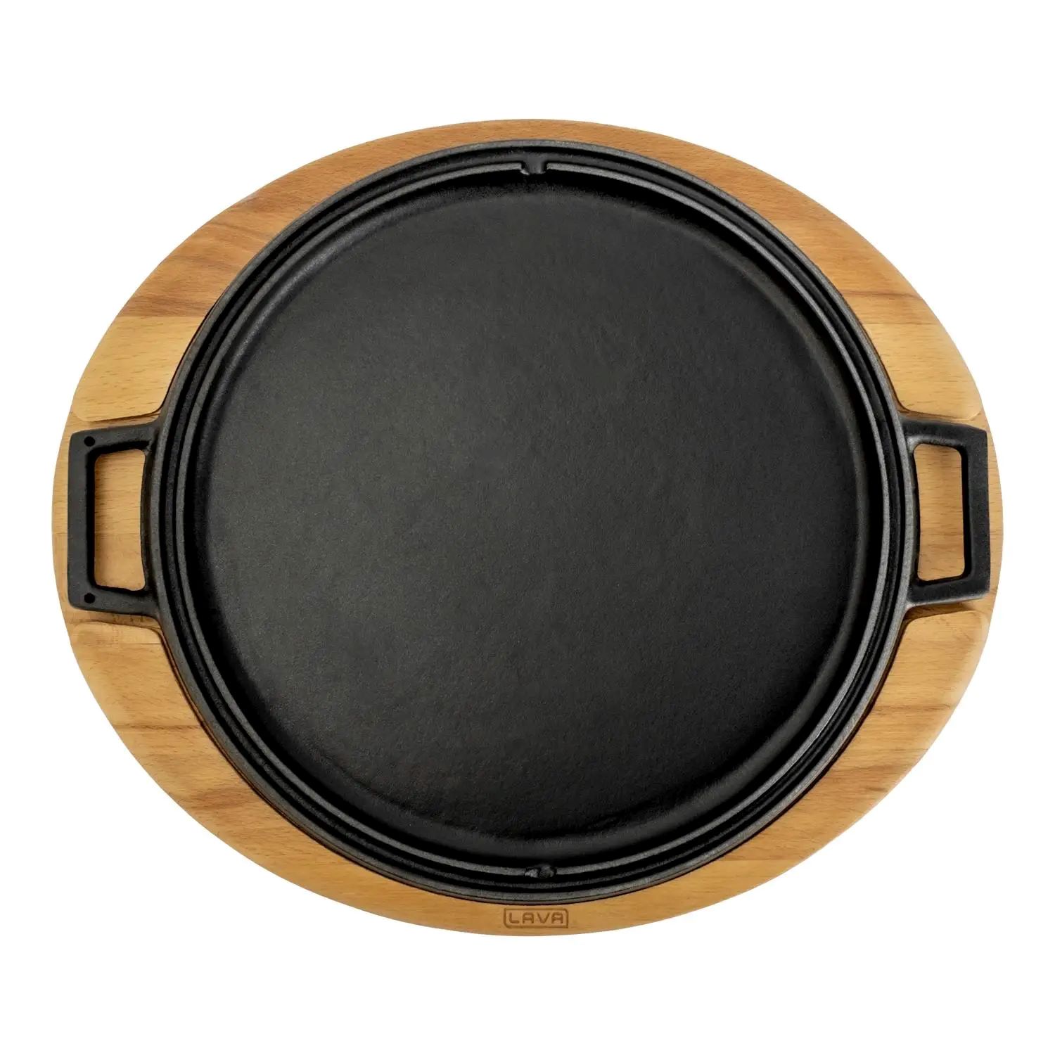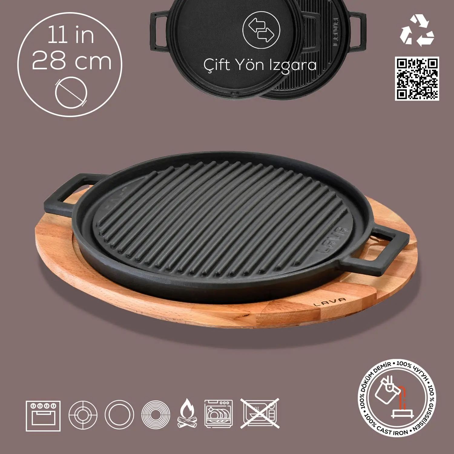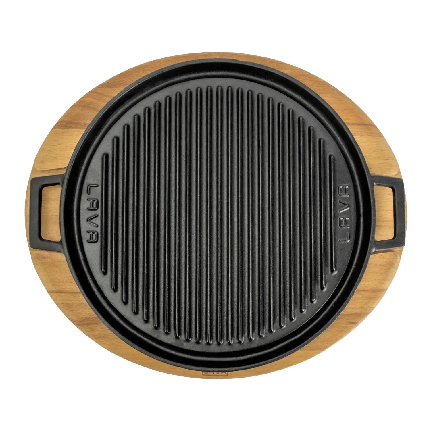 Megfordítható grill állvánnyal, Lava márka öntöttvasból, 28 cm átmérőjű. A termék egyik oldalán grillezővel, másik oldalán főzőlappal van ellátva.
