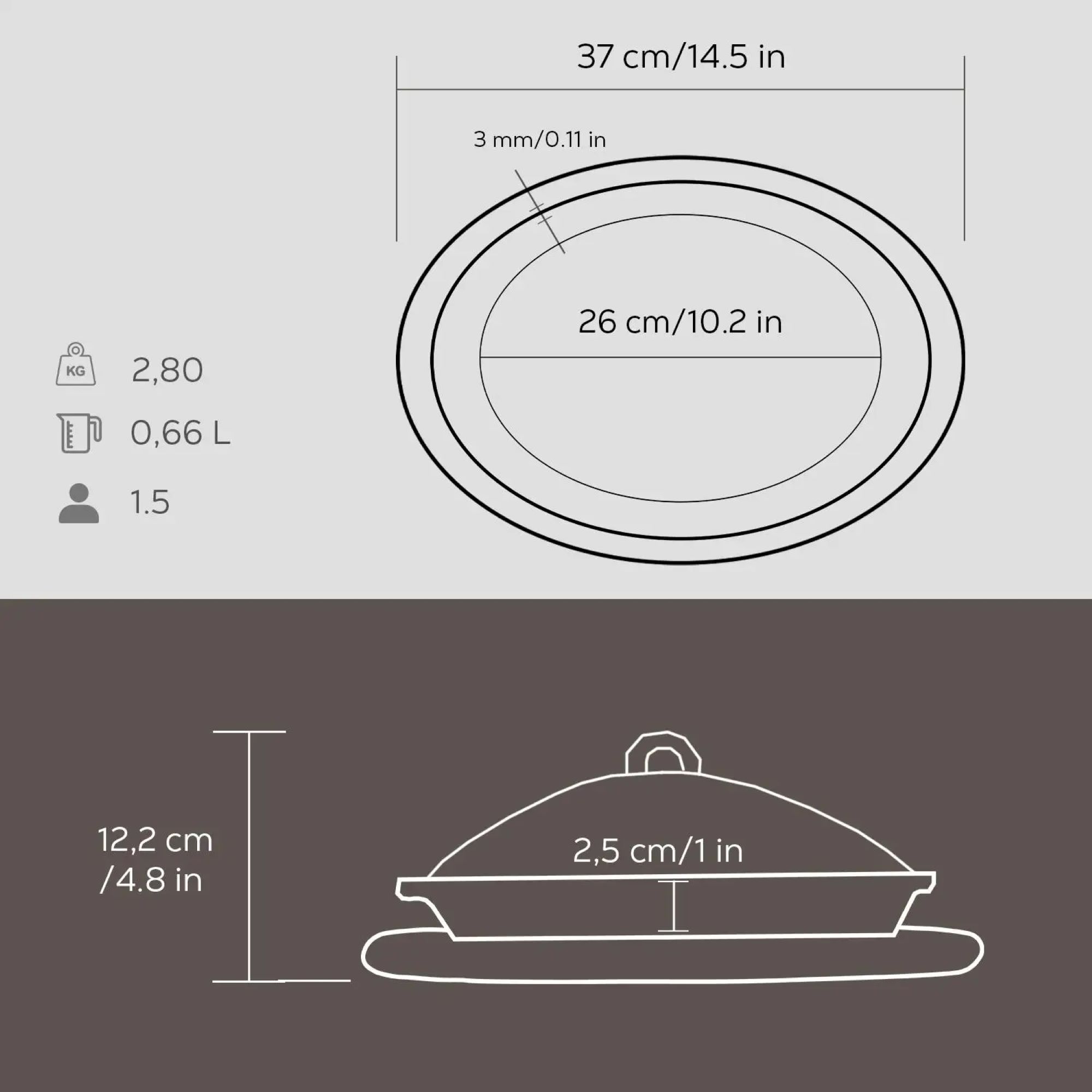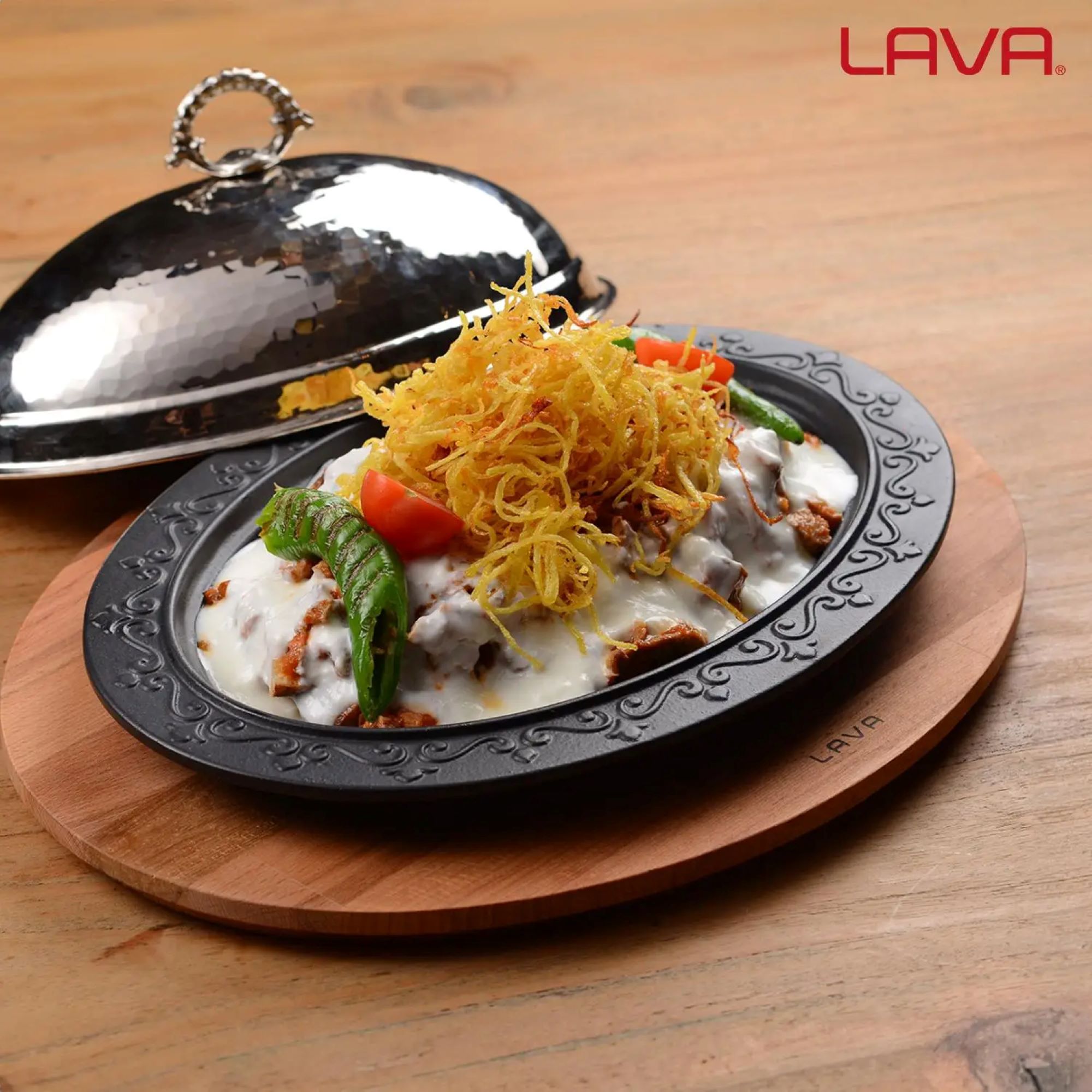 Ovális alakú tálalótál fedéllel, Láva márka, öntöttvasból készült.