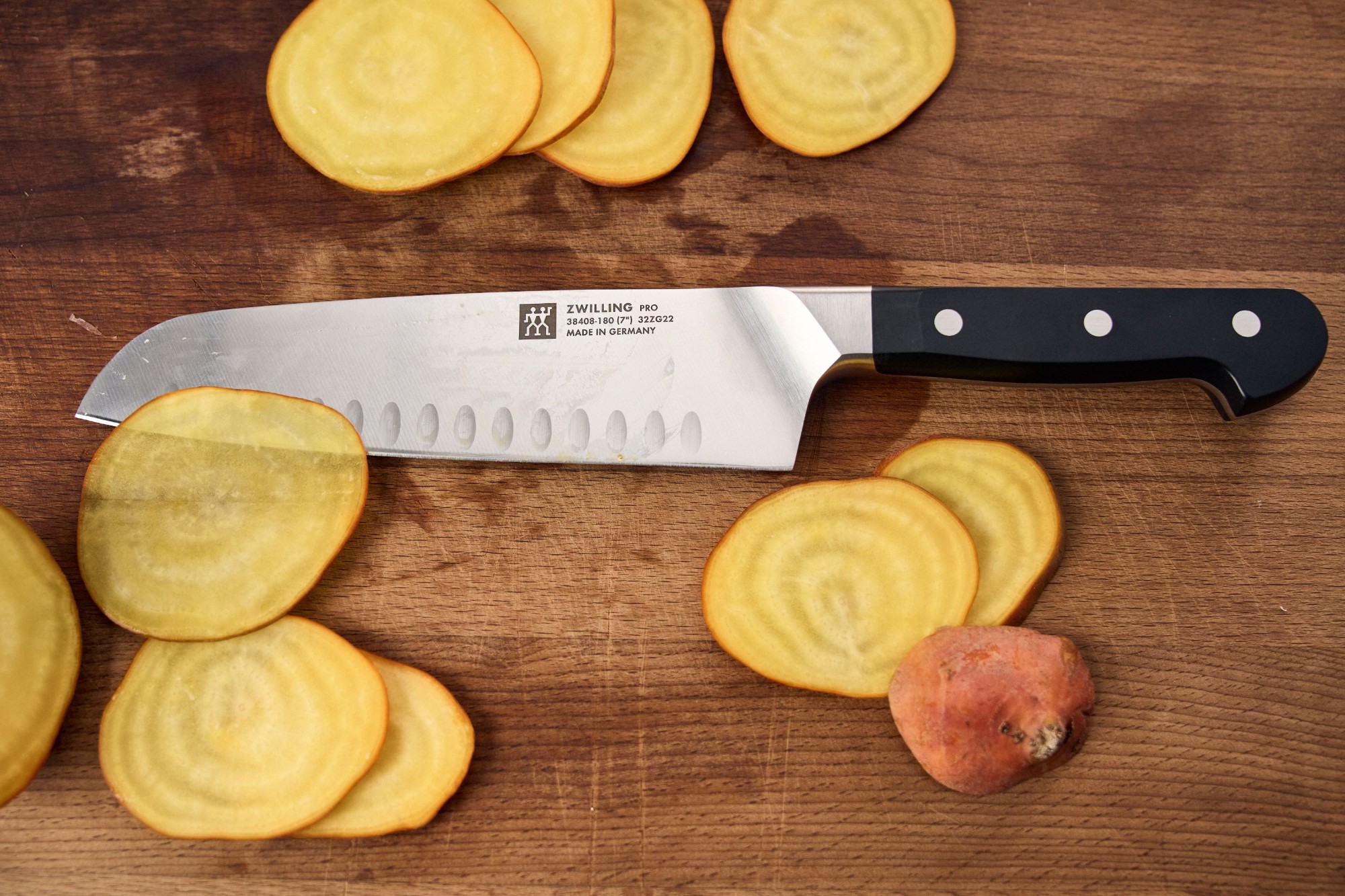 Santoku kés, Zwilling márka, 18 cm hosszú pengével, bemélyedésekkel, amelyet speciális rozsdamentes acélból gyártanak a legmagasabb szabványoknak megfelelően, korrózióálló és ütésálló.