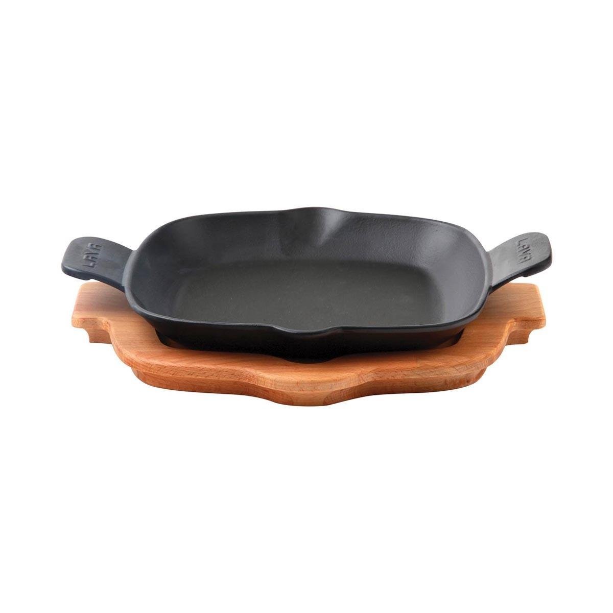 Négyzet alakú serpenyő állvánnyal, Lava márkájú, 26 x 26 cm méretű, öntöttvasból.
