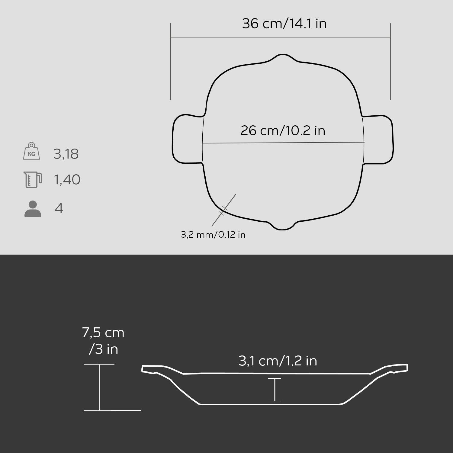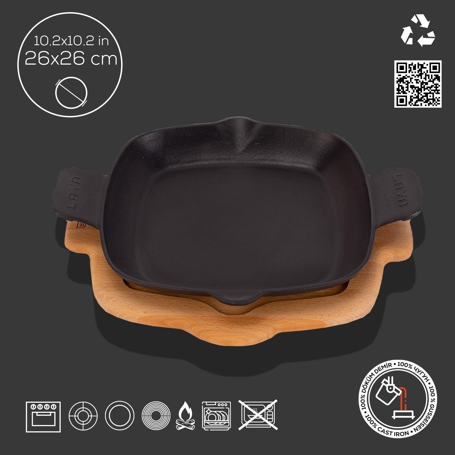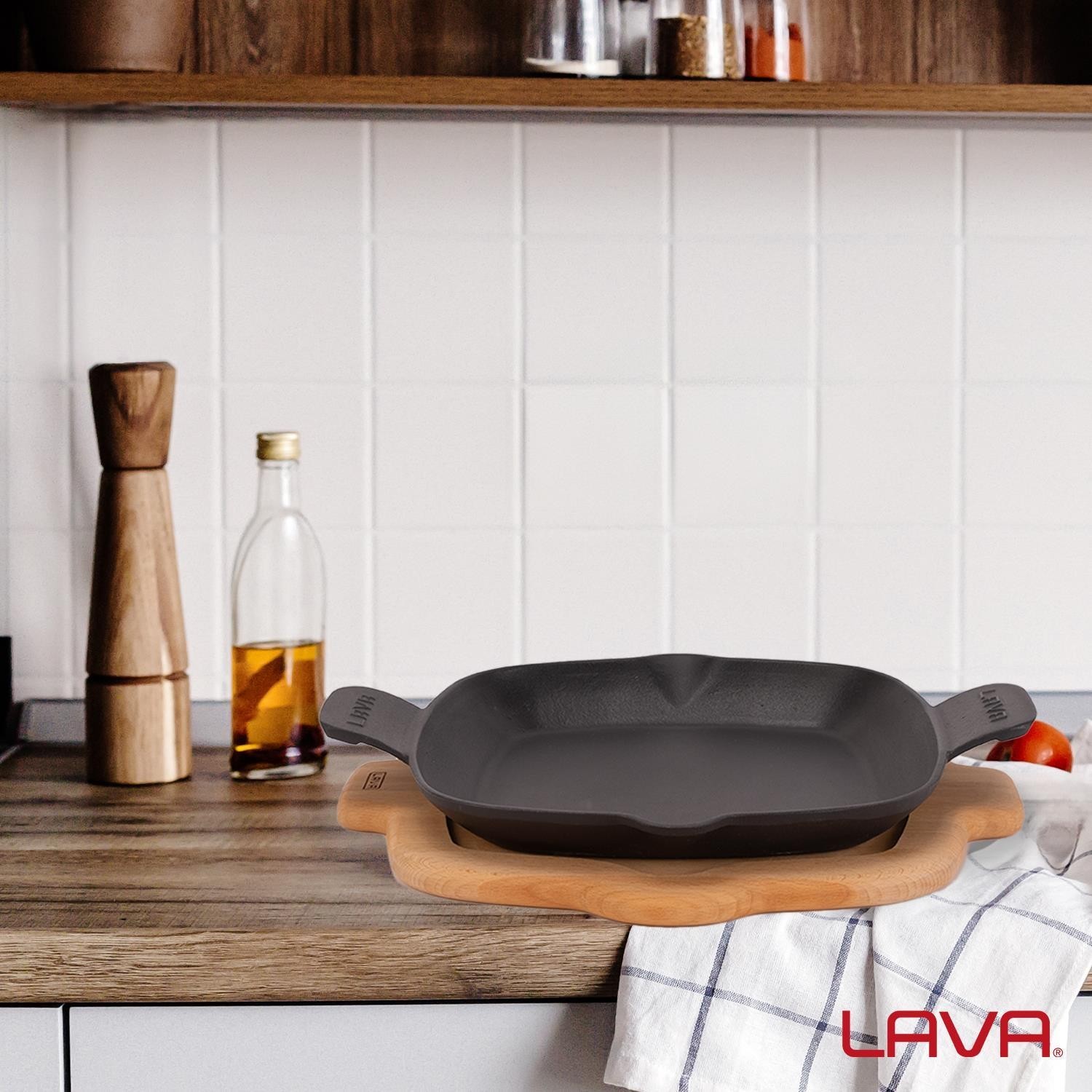 A serpenyő alja 5 mm vastag, és lehetővé teszi a Lava edények használatát minden típusú főzőlapon, beleértve az indukciós főzőlapot is. Nem használható mikrohullámú sütőben.