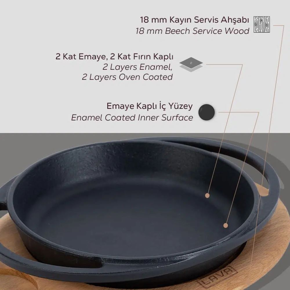 Az edény oldalának vastagsága 4 mm. Az edény belső felületén egy fekete zománcréteg van, amely zsiradék használatával egy tapadásmentes réteget biztosít. Fogantyúinak anyaga öntvény.