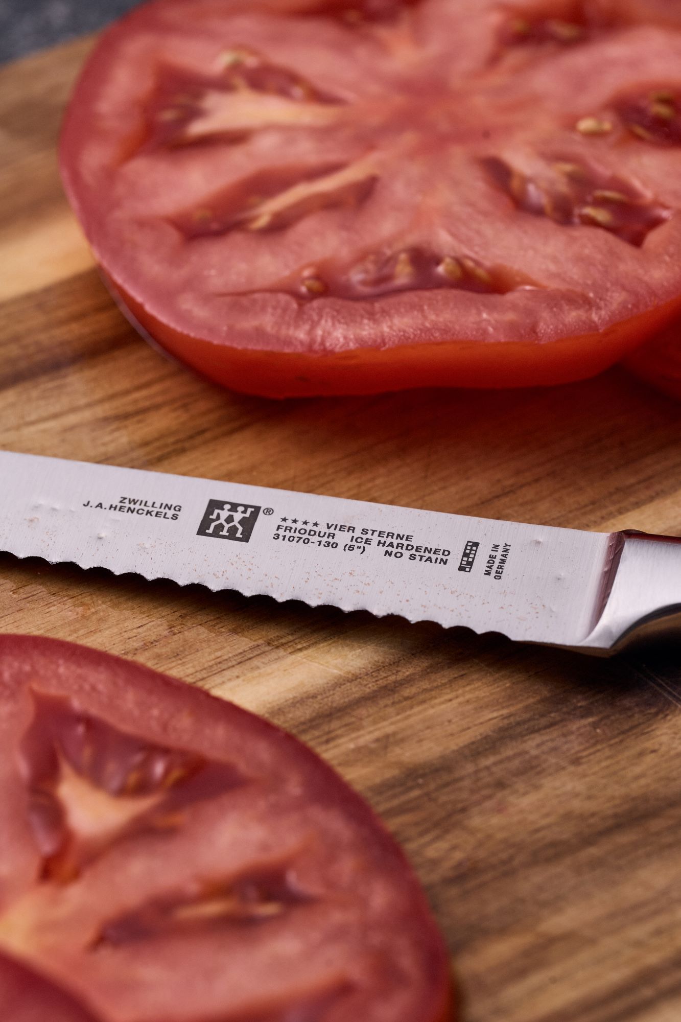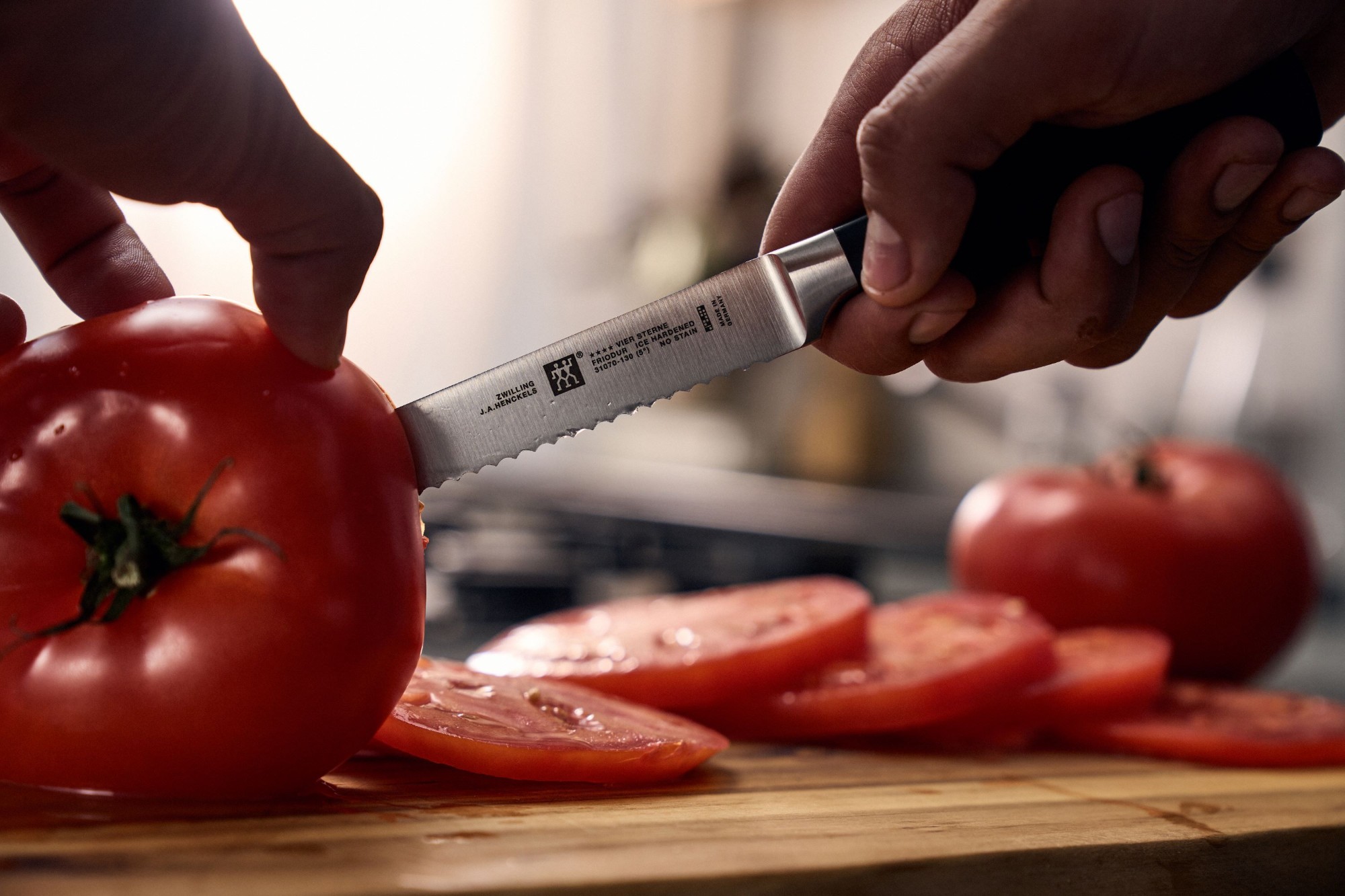Zwilling márkájú univerzális kés, 13 cm hosszú fogazott pengével, speciális rozsdamentes acélból, amely korrózióálló és ütésálló.
